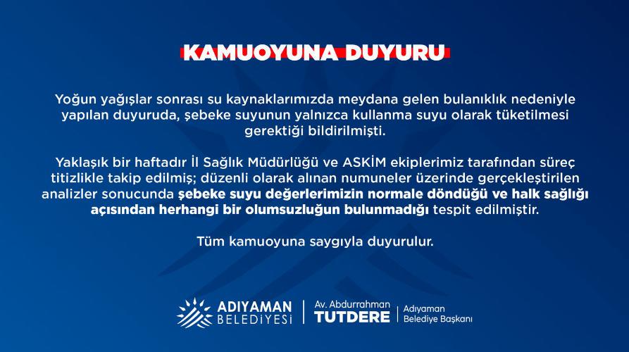 Yoğun yağışların ardından su kaynaklarında meydana gelen bulanıklık nedeniyle tedbir amaçlı olarak yalnızca kullanma suyu olarak değ...