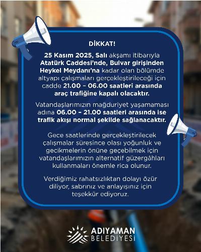 Adıyaman Belediyemiz 25 Kasım tarihinde Çarşı merkezinde yapılacak altyapı çalışmaları esnasında uygulanacak alternatif güzergahlarl...