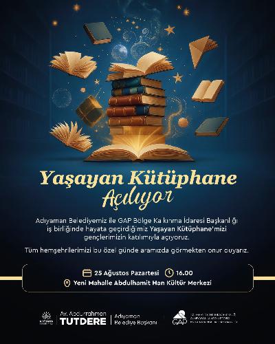“Adıyaman Belediyemiz ve GAP Bölge Kalkınma İdaresi iş birliğiyle hayata geçirdiğimiz Yaşayan Kütüphane’mizin açılışını gerçekleştiriyoruz. Gençlerimizin ders çalışabilecekleri sessiz ortam, araştırma yapabilecekleri zengin kitaplıklar ve dijital araştırma salonlarıyla onların ufkunu genişletecek özel bir mekânı şehrimize kazandırmanın mutluluğunu yaşıyoruz. Tüm hemşehrilerimizi, gençlerimizle birlikte bugün saat 16.00’da Yeni Mahalle Abdulhamit Han Kültür Merkezi’mizde yapacağımız kütüphane açılışımıza davet ediyoruz.”